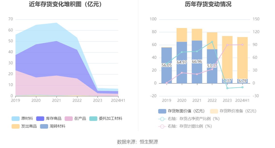 从存货变动来看,截至2024年上半年末,公司存货账面价值为6.79亿元,占净资产的-9.23%,较上年末减少5790.23万元。其中,存货跌价准备为65.57亿元,计提比例为90.62%。