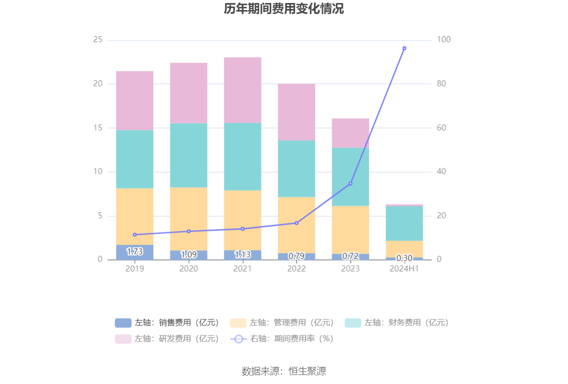 2024年上半年,公司期间费用为6.33亿元,较上年同期减少3012.45万元;但期间费用率为96.32%,较上年同期上升76.38个百分点。其中,销售费用同比下降18.83%,管理费用同比下降35.93%,研发费用同比下降89.89%,财务费用同比增长210.48%。