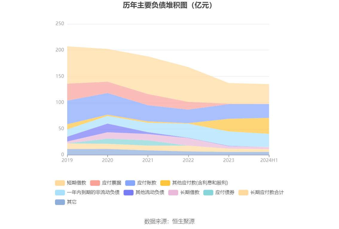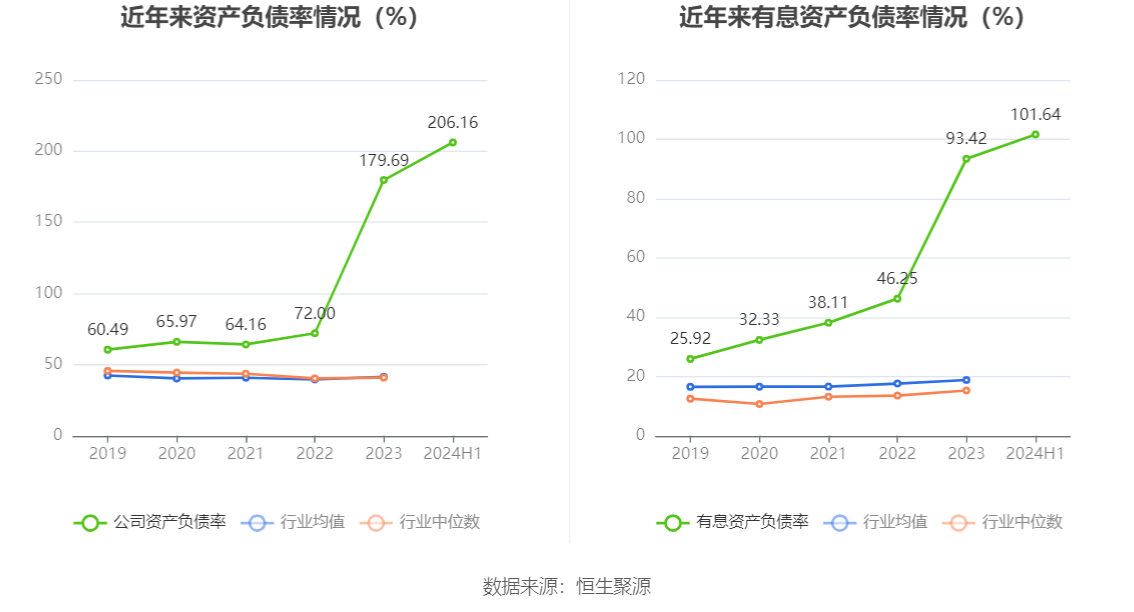 在偿债能力方面,公司2024年上半年末资产负债率为206.16%,相比上年末上升26.47个百分点;有息资产负债率为101.64%,相比上年末上升8.22个百分点。