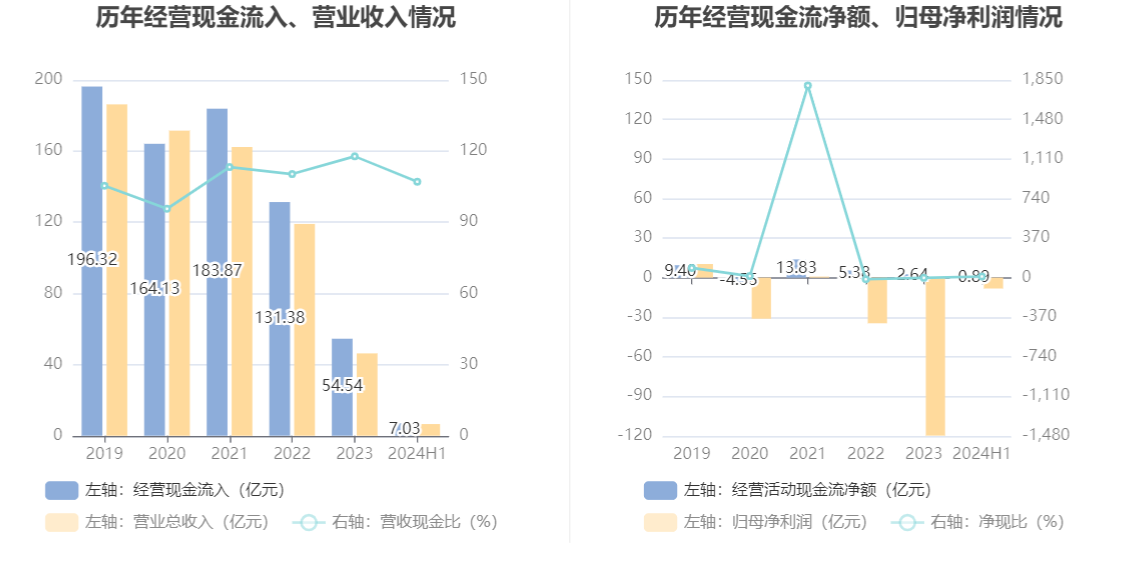 进一步统计发现,2024年上半年公司自由现金流为5.35亿元,相比上年同期下降72.82%。