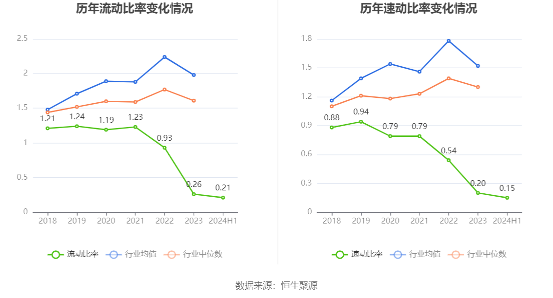 2024年上半年,公司流动比率为0.21,速动比率为0.15。