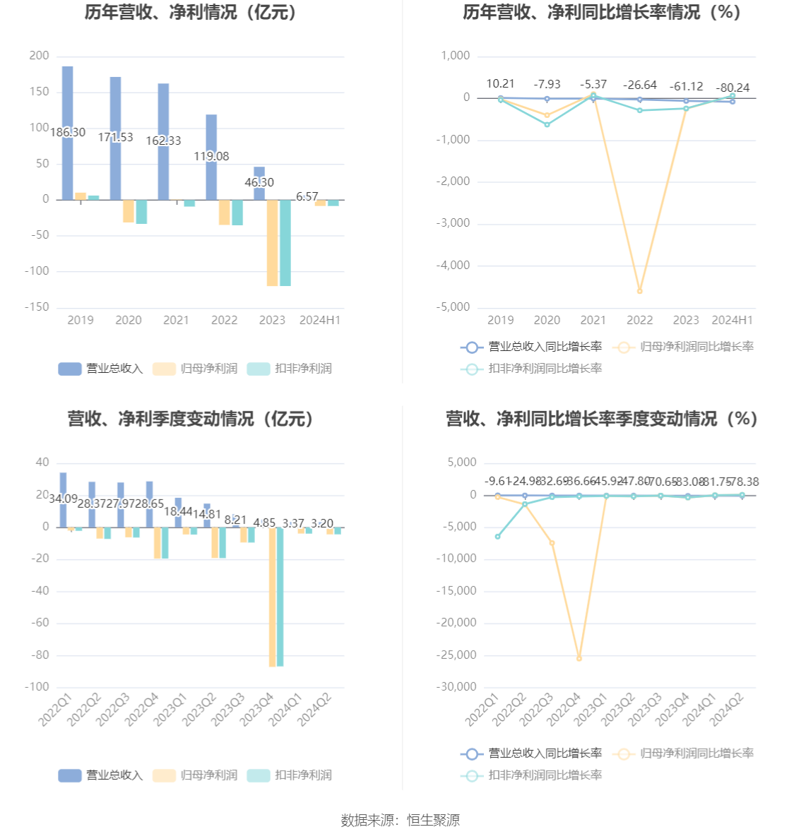 根据半年报,公司第二季度实现营业总收入3.2亿元,同比下降78.38%,环比下降4.85%;归母净利润-4.38亿元,同比增长77.04%,环比下降13.57%;扣非净利润-4.35亿元,同比增长77.31%,环比下降11.17%。