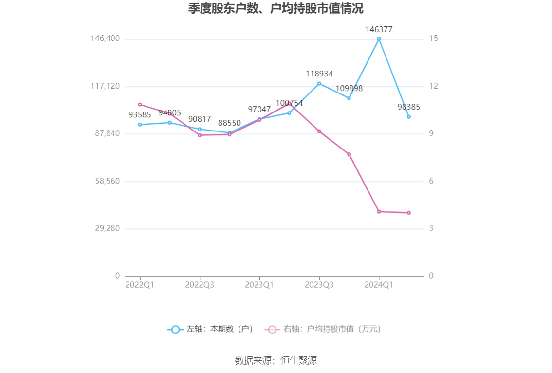 筹码集中度方面,截至2024年上半年末,公司股东总户数为9.84万户,较一季度末下降了4.8万户,降幅32.79%;户均持股市值由一季度末的4.09万元下降至4.02万元,降幅为1.71%。