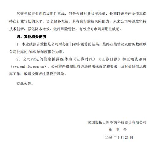 1月31日,拓日新能发布2025年度业绩预告。