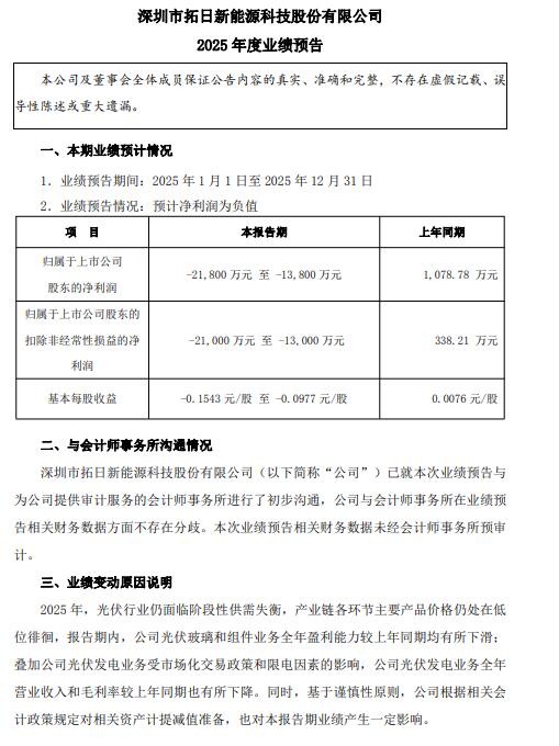 公告显示,拓日新能2025年预计亏损1.3-2.1亿元。