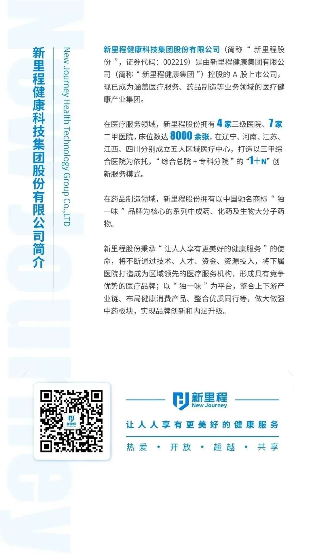 作为国内领先的医疗健康企业,新里程股份一直身体力行,践行健康中国战略,推动ESG建设,积极履行社会责任。在医疗服务领域依托“一个综合总院+多个专科分院”的“1+N”模式,在全国构建五大区域医疗中心,助力优质医疗资源的扩容和区域均衡布局;在药品制造领域以驰名商标“独一味”为平台,推动中医药事业的发展和中医药文化的传承,促进中医药产业成为乡村振兴和文化自信的重要部分。