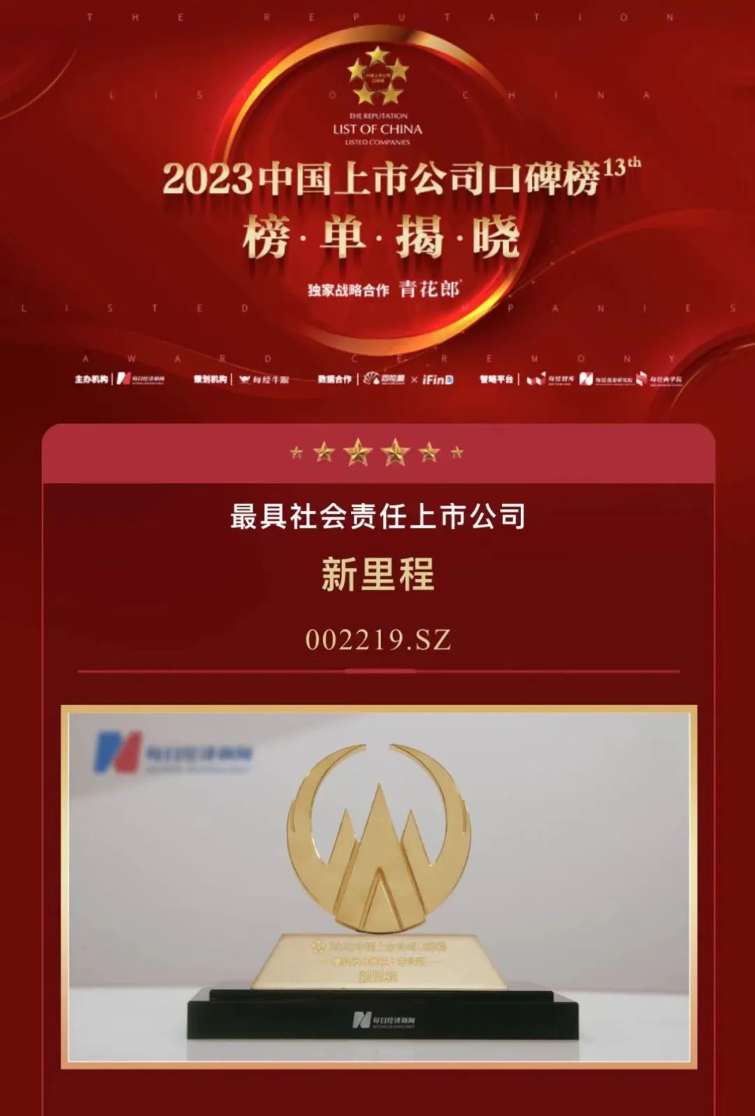 11月17日,新里程健康科技集团股份有限公司在“2023第十二届中国上市公司高峰论坛”上荣获“最具社会责任上市公司”称号。