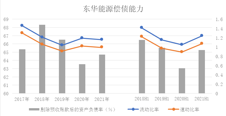 从半年报来看,2018年至2021年上半年,东华能源的流动比率分别为1.41、1.15、1.05、1.24,2021年上半年公司流动比率较2020年同期相比有所上升。速动比率分别为1.22、0.97、0.89、1.07,2021年上半年公司速动比率较2020年同期相比有所上升。剔除预收账款后的资产负债率分别为66.49%、65.54%、63.04%、65.24%,2021年上半年公司剔除预收账款后的资产负债率较2020年同期相比有所上升。