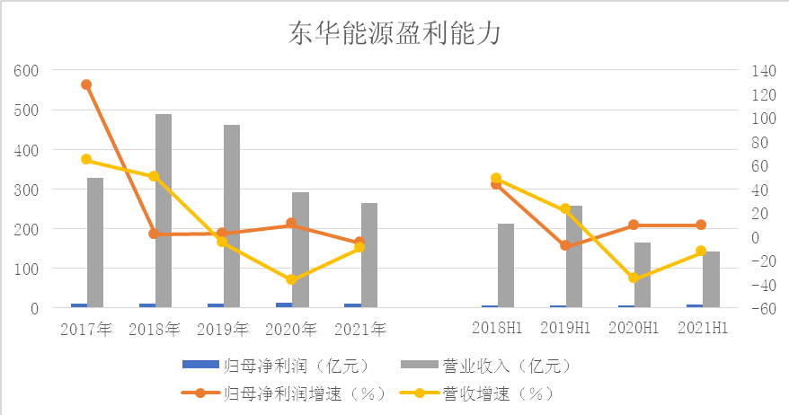从半年报来看,2018年至2021年上半年,东华能源的归母净利润分别为6.93亿元、6.33亿元、6.91亿元、7.52亿元,2021年上半年公司归母净利润较2020年同期相比有所上升。归母净利润增速分别为42.51%、-8.70%、9.08%、8.92%,2021年上半年公司归母净利润增速较2020年同期相比有所下降。营业收入分别为212.28亿元、258.18亿元、164.50亿元、142.59亿元,2021年上半年公司营业收入较2020年同期相比有所下降。营收增速分别为47.81%、21.62%、-36.29%、-13.32%,2021年上半年公司营收增速较2020年同期相比有所上升。