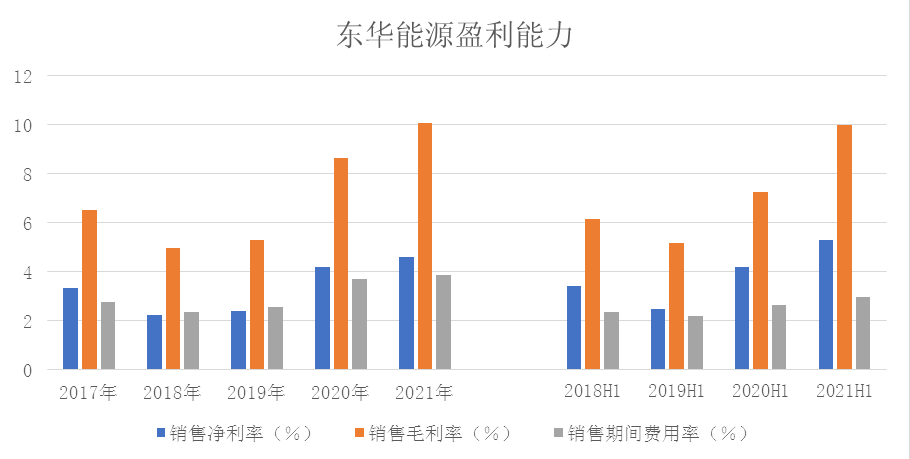 从半年报来看,2018年至2021年上半年,东华能源的销售净利率分别为3.41%、2.46%、4.20%、5.28%,2021年上半年公司销售净利率较2020年同期相比有所上升。销售毛利率分别为6.13%、5.18%、7.27%、10.00%,2021年上半年公司销售毛利率较2020年同期相比有所上升。公司销售期间费用率分别为2.33%、2.18%、2.62%、2.96%,2021年上半年公司销售期间费用率较2020年同期相比有所上升。