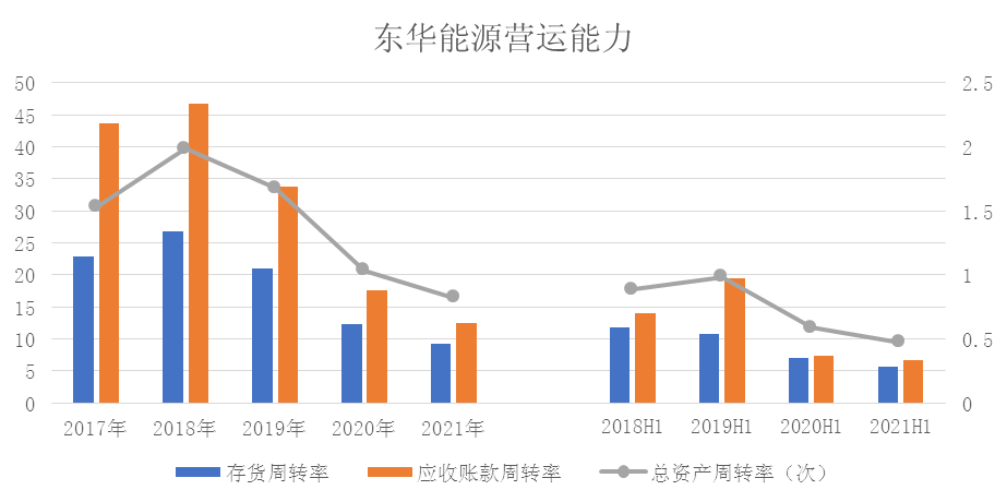 从半年报来看,2018年至2021年上半年,东华能源的存货周转率分别为11.74、10.79、6.96、5.73,2021年上半年公司存货周转率较2020年同期相比有所下降。应收账款周转率分别为14.07、19.47、7.46、6.66,2021年上半年公司应收账款周转率较2020年同期相比有所下降。总资产周转率分别为0.89次、0.98次、0.59次、0.47次,2021年上半年公司总资产周转率较2020年同期相比有所下降。