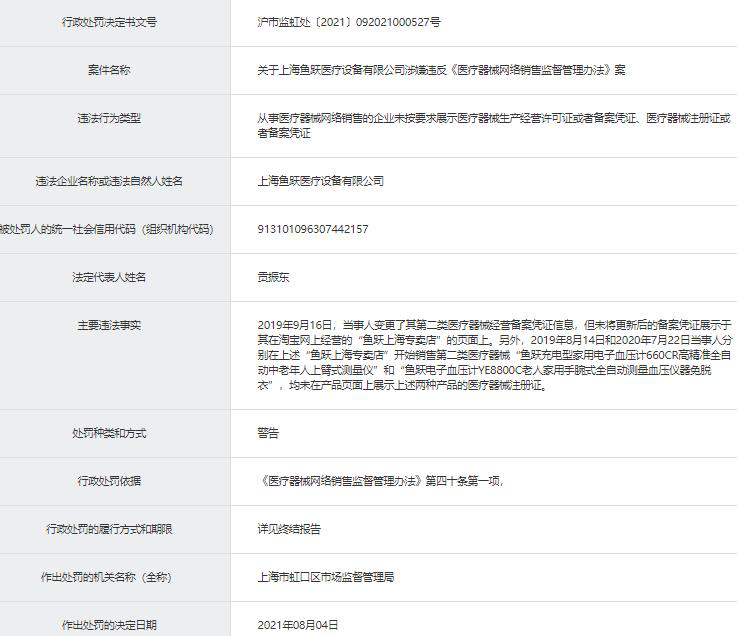 上海市药品监督管理局网站近日公布了关于上海鱼跃医疗设备有限公司涉嫌违反《医疗器械网络销售监督管理办法》案的行政处罚决定书(沪市监虹处〔2021〕092021000527号)。