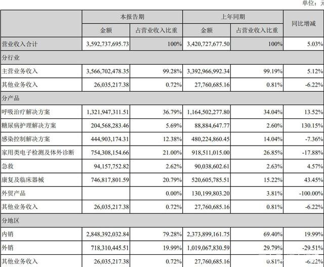 在主要业务品类中,制氧机产品国内外业务同比增长超过160%,雾化产品较去年同期销售业务同比增速达220%。糖尿病相关产品业务较去年同期增长超过130%,用类电子检测及体外诊断业务主要产品电子血压计产品同比增速近110%。,康复及临床器械板块业务增长势头较好,其中轮椅类产品销售持续恢复,同比增速超过120%,针灸类产品同比增速超23%,各类康复护理类产品销售较去年同期均有较快成长。