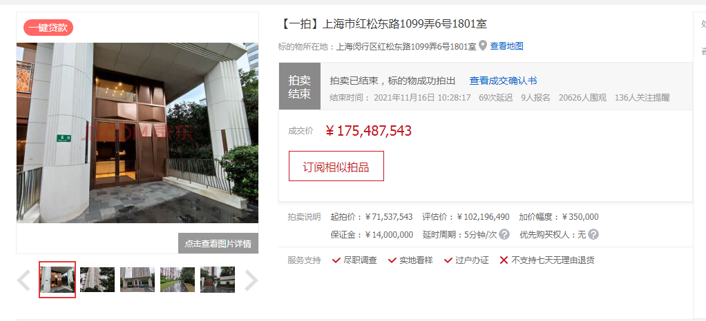 记者在京东拍卖上看到,广东省深圳市中级人民法院在11月15日~16日对一处位于上海市红松东路1099弄6号1801室的房产进行网络公开拍卖。根据标的物详情介绍,该房产位于古北壹号小区内,建筑面积高达665.03平方米,房屋类型为公寓。房屋所在楼栋的结构为钢混,总层数为17层,竣工时期为2015年。