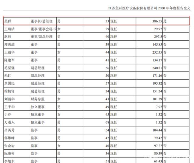 此外,根据鱼跃医疗发布的2020年年度报告显示,作为公司董事长兼总经理的吴群从公司取得的税前报酬总额为386.55万元。