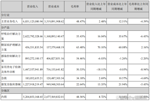 下图展示了鱼跃医疗具体的营收情况,在呼吸治疗解决方案占总营收的37%,这一块营业收入同比增加16.04%,不过这块产品的毛利率是下降最多的,下降了6.45个百分点。