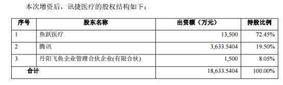 增资完成后,腾讯持有的出资额为3633.54万元,占比19.5%,为讯捷医疗第二大股东。