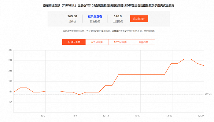 通过对历史价格的查询,鱼跃医疗一款型号YX102的血氧仪也在一个月内实现了价格翻倍。
