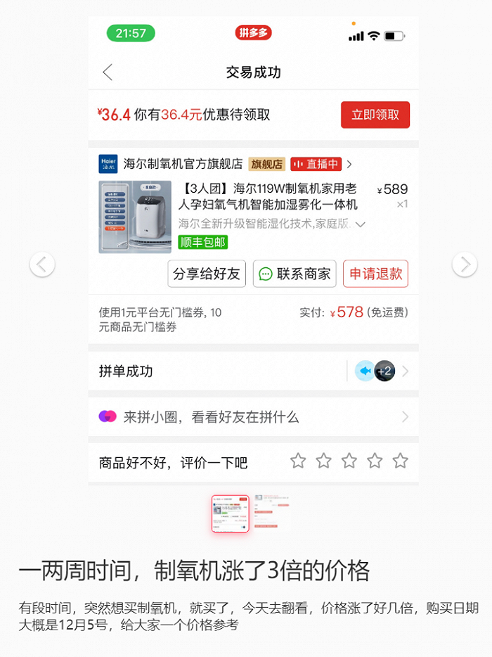 制氧机价格上涨更是离谱。一位网友称其12月5日购买的海尔119W制氧机,价格仅不到600元,但目前已经涨至1400元,不到一个月的时间价格已经翻了两倍还多。