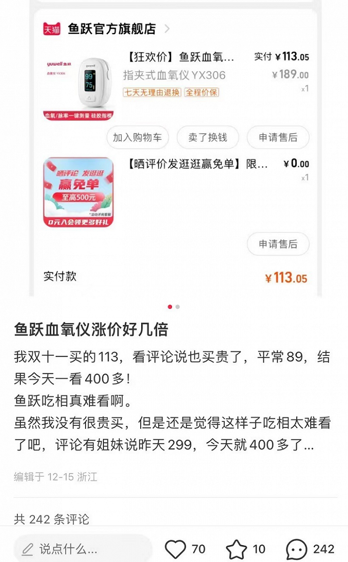 在某社交平台上,不少用户表示,鱼跃一款手指夹式家用血氧仪在一个月前买的还是113元,平常价格更是低至89元,然而目前价格已经翻倍,甚至达到400元左右。