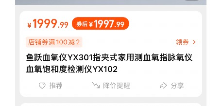 新浪财经了解到,淘宝上“泰荣源医疗器械城销售的“鱼跃血氧仪YX301指夹式家用测血氧”的标价为券后1997.99元。但鱼跃医疗官方店中,型号为YX301的血氧仪标价则是299元,但始终处于缺货状态。