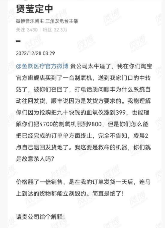 12月28日消息,今日收到网友投诉,该用户在鱼跃医疗官方旗舰店买了一台制氧机,送到家门口中转站后,被鱼跃召回。网友表示,可以理解特殊时期把4700元的制氧机产品价格涨到9800元,但是不应该单方面终止订 单。