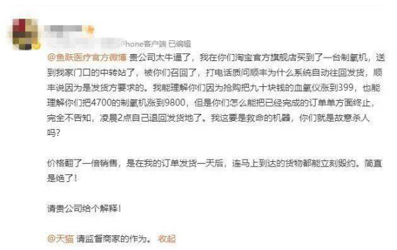 据深圳商报,12月28日,有网友向鱼跃医疗官方微博投诉称,自己在其淘宝官方旗舰店购买了一台制氧机,但在商品即将送到家门口之际,制氧机却被商家“召回”。另外,消费者还质疑鱼跃医疗的血氧仪、制氧机因为抢购而出现翻倍涨价的情形。