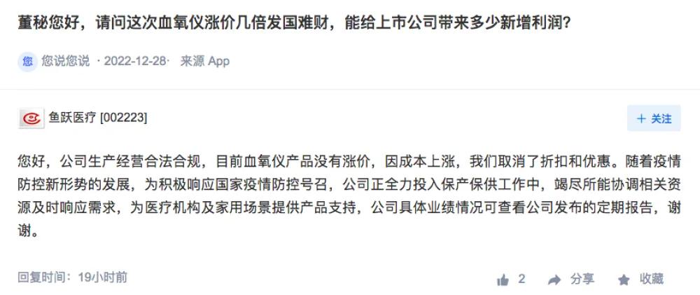 2022年12月28日,一位投资者在深交所互动易平台上对鱼跃医疗提问称:“董秘您好,请问这次血氧仪涨价几倍发国难财,能给上市公司带来多少新增利润?”