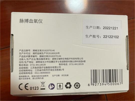 在鱼跃医疗京东官方旗舰店,有消费者晒出购买的血氧仪,外包装上明确生产商是湖南艾瑞特生物医疗科技有限公司,鱼跃医疗是总经销商。
