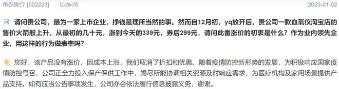 对此鱼跃医疗回应称是商家自行定价,之后被扒出旗舰店的登记商家就是旗下子公司;之后又回应投资者并非涨价,而是成本上升后取消了优惠折扣。