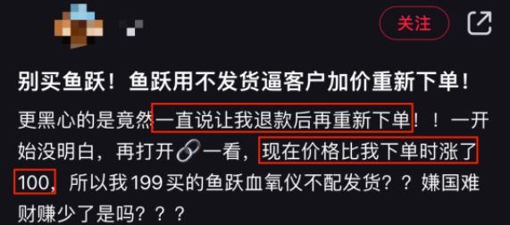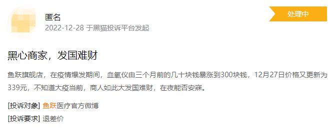 在黑猫投诉平台上,也能看到针对鱼跃的相关投诉,投诉理由包括“涨价”、“虚假发货、拒不发货”、“临期加价”、“不发货且拒绝退款”等。有消费者还表示,鱼跃旗舰店血氧仪的价格从三个月前的几十块钱上涨至12月27日的339元,是在发国难财。