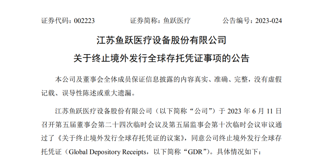 2023年6月11日,鱼跃医疗发布公告称,终止境外发行全球存托凭证事项。