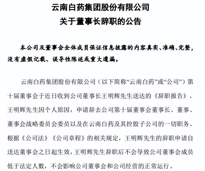 2023年3月,云南白药发布公告称,收到王明辉送达的《辞职报告》,其因个人原因申请辞去董事长、董事、董事会战略委员会委员以及在云南白药及其控股子公司的一切职务。