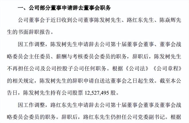 陈发树申请辞去的是云南白药第十届董事会董事、董事会战略委员会主任委员、薪酬与考核委员会委员的职务,辞职后,陈发树不再担任公司及公司控股子公司任何职务。截至该公告日,陈发树持有公司股票12,527,495股。