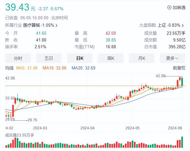 2024年6月5日,鱼跃医疗早盘股价好好的,午盘跳水,最终跌超5%。什么情况?
