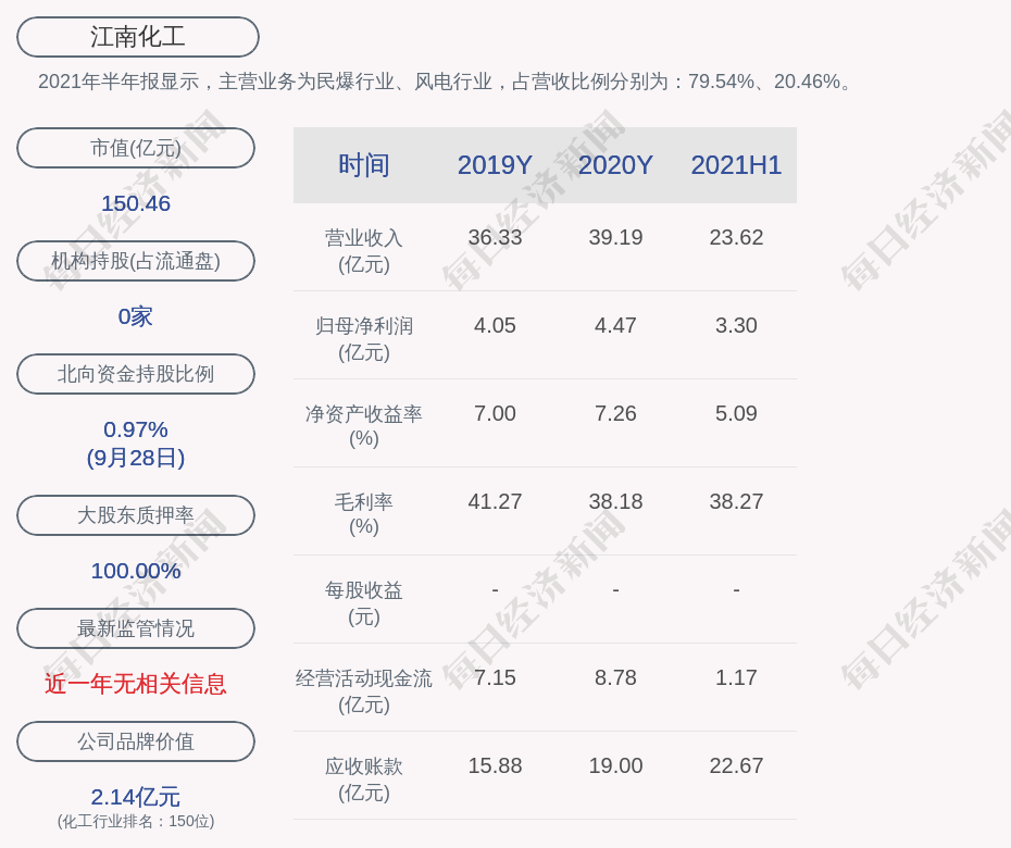 2021年半年报显示,江南化工的主营业务为民爆行业、风电行业,占营收比例分别为:79.54%、20.46%。