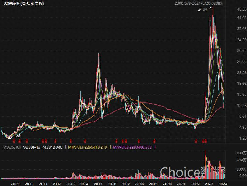 鸿博股份于2008年5月8日在深圳证券交易所上市,股票发行价格为13.88元/股,上市首日收盘时,公司总市值约为18.59亿元。Choice金融终端数据显示,2023年8月下旬,鸿博股份的收盘总市值一度创下超225亿元的高光时刻。