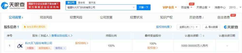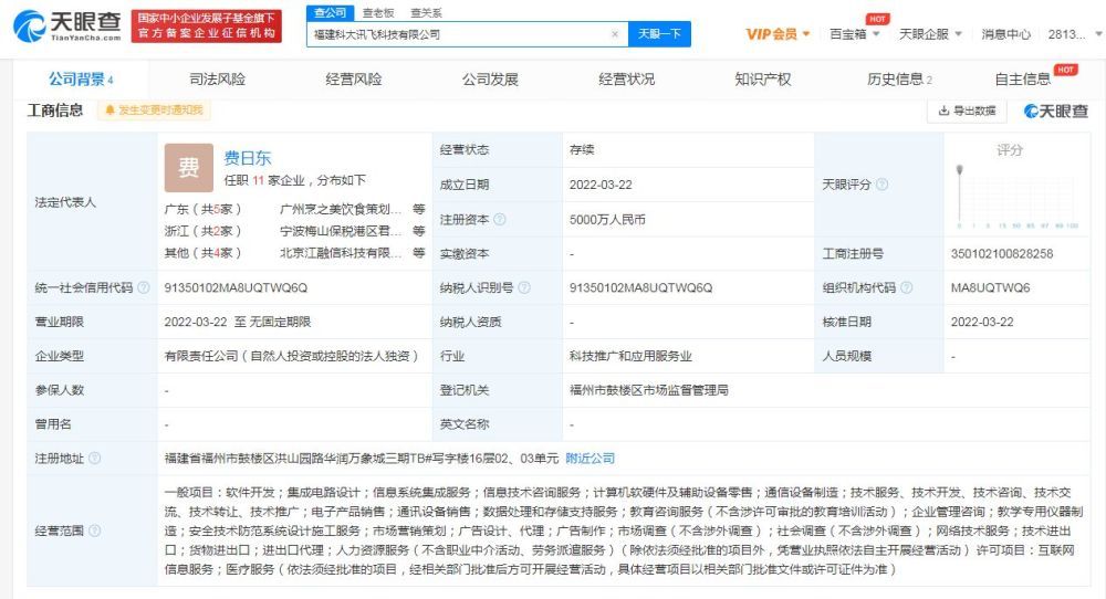 近日,福建科大讯飞科技有限公司成立,法定代表人为费日东,注册资本5000万人民币,经营范围含集成电路设计;通信设备制造销售;教学专用仪器制造;互联网信息服务;医疗服务等。股东信息显示,该公司由科大讯飞股份有限公司全资持股。