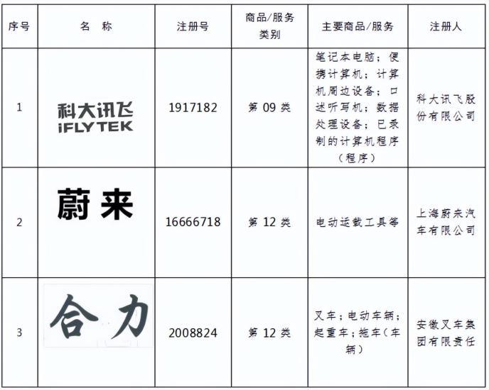 近日,安徽省市场监管局发布第一批安徽省商标保护名录,“科大讯飞”“蔚来”“精隆电工”“年份原浆”“海螺”等25个商标入选。