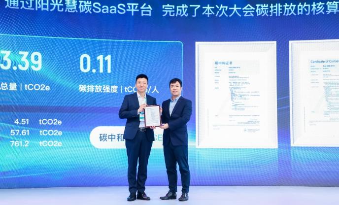 会议现场,阳光慧碳科技有限公司副总裁陈韦作为代表,为本次会议颁发了碳中和证书,科大讯飞云平台业务群副总裁周传福作为本次大会碳中和合作方代表出席领证。