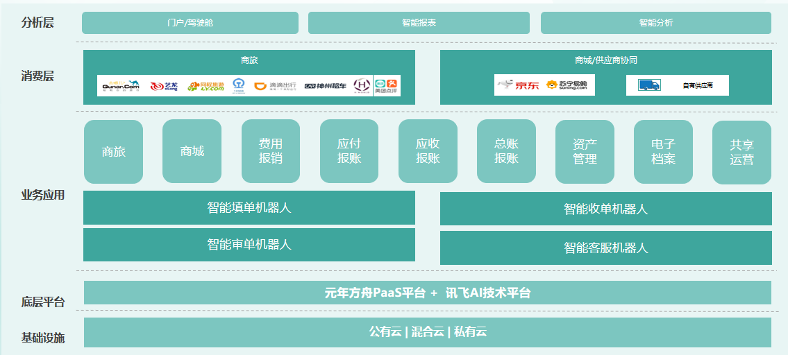 报账机器人有非常完整的功能架构。从基础设施上看,报账机器人既可以以公有云方式提供SaaS服务,也支持混合云、私有云、OP方式部署,底座就建立在元年方舟PaaS平台和讯飞AI技术平台之上。