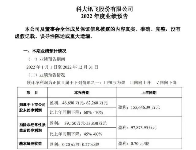 1月29日晚间,科大讯飞(002230)发布公告,预计2022年度实现营业收入183.14-201.45亿元,较上年同期增长0%-10%;预计实现毛利75.33-82.87亿元,较上年同期增长0%-10%;预计实现净利润4.67亿元-6.23亿元,同比下降60%-70%,扣非净利润3.92-5.38亿元,同比下降45%-60%。值得注意的是,因持股的三人行、寒武纪、商汤等金融资产股价波动,导致科大讯飞公允价值变动收益金额较上年同期减少约5.87亿元。