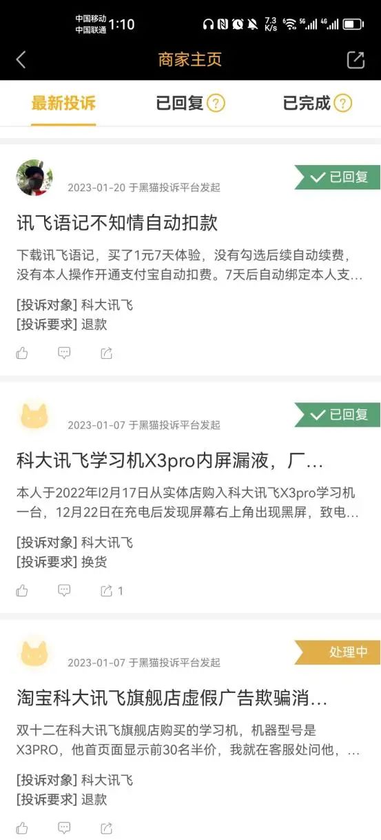 浏览黑猫投诉,截止2023年2月6日18时,科大讯飞共有173条投诉。除了宣传、售后服务质疑等,产品质量吐槽也是焦点,如“科大讯飞T10死机”、“录音笔B1质量问题”、“X3pro学习机内屏漏液,拒绝三包”等。