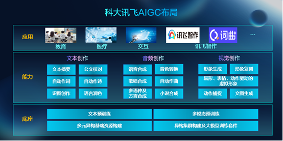 高建清表示,科大讯飞的AIGC整体布局可以总结为三层架构:“底座+能力+应用”,是,形成了音频创作、视觉创作、文本创作三大AIGC能力,进而衍生出在教育、医疗、人机交互等领域的丰富应用。