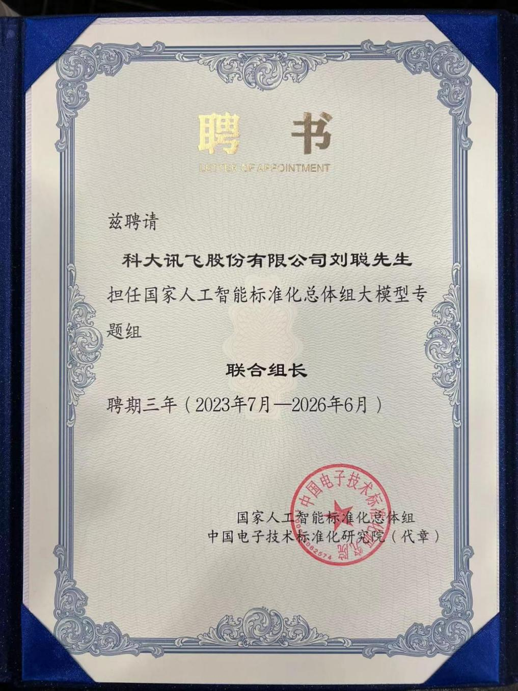 科大讯飞研究院院长刘聪被聘为国家人工智能标准化总体组大模型专题组联合组长,代表科大讯飞进一步参与大模型国家标准制定工作。
