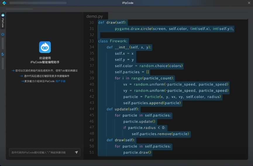 用户只要前往iFlyCode官网加入公测,就可以获得iFlyCode一个月的使用权。它支持代码生成、代码解释、代码纠错、单元测试和智能问答五大功能,可以提供注释生成代码、根据上下文补齐代码、提供代码纠错建议、生成单元测试代码、提供代码编程知识问答等专业服务。虽然笔者没有像讯飞研究院院长刘聪在发布会上那样,仅通过几步Prompt就创造了“凌空手写”这个神奇应用,但也很轻松生成了一个简易图形应用。