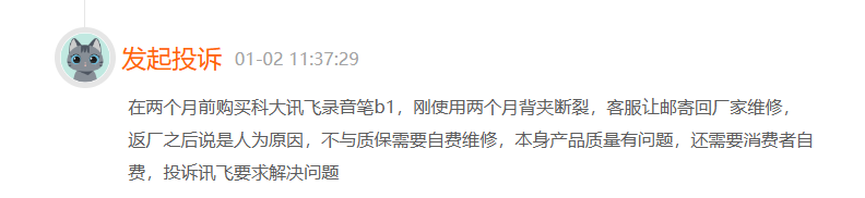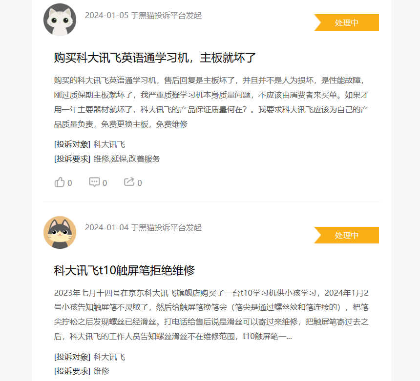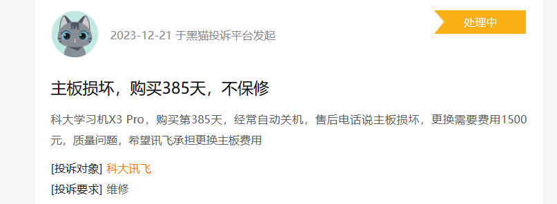浏览黑猫投诉,截至2024年1月17日21时,科大讯飞相关投诉509条,涉及虚假宣传、质量差、自动扣款等质疑。例如,科大讯飞录音笔B1使用两个月背夹断裂;科大学习机X3 Pro主板损坏,经常关机……