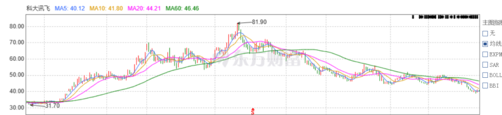 得益于大模型的资本热度,科大讯飞股价在2023上半年迎来一波强势大涨,6月一度攀至81.9元高点,较开年的32.8元累涨超150%。