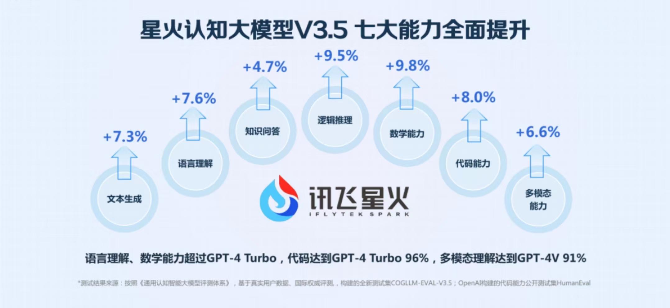 最新版本,是1月30日的讯飞星火V3.5,七大能力全面升级,在语言理解、数学能力、语音交互能力超过GPT-4 Turbo,代码达到GPT-4 Turbo 96%,多模态理解达到GPT-4V 91%。