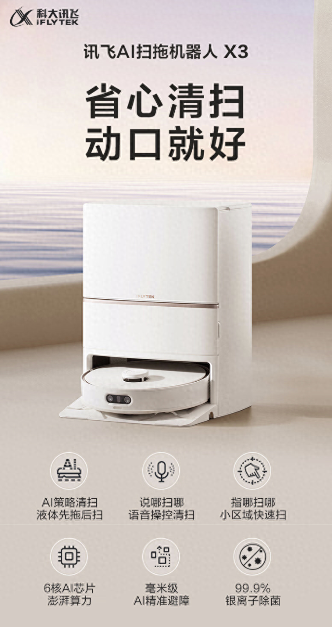 2月21日消息,讯飞今天在京东上架一款 AI 扫拖机器人 X3,主打“AI 策略清扫”,号称可以“指哪扫哪”,首发价 3999 元。